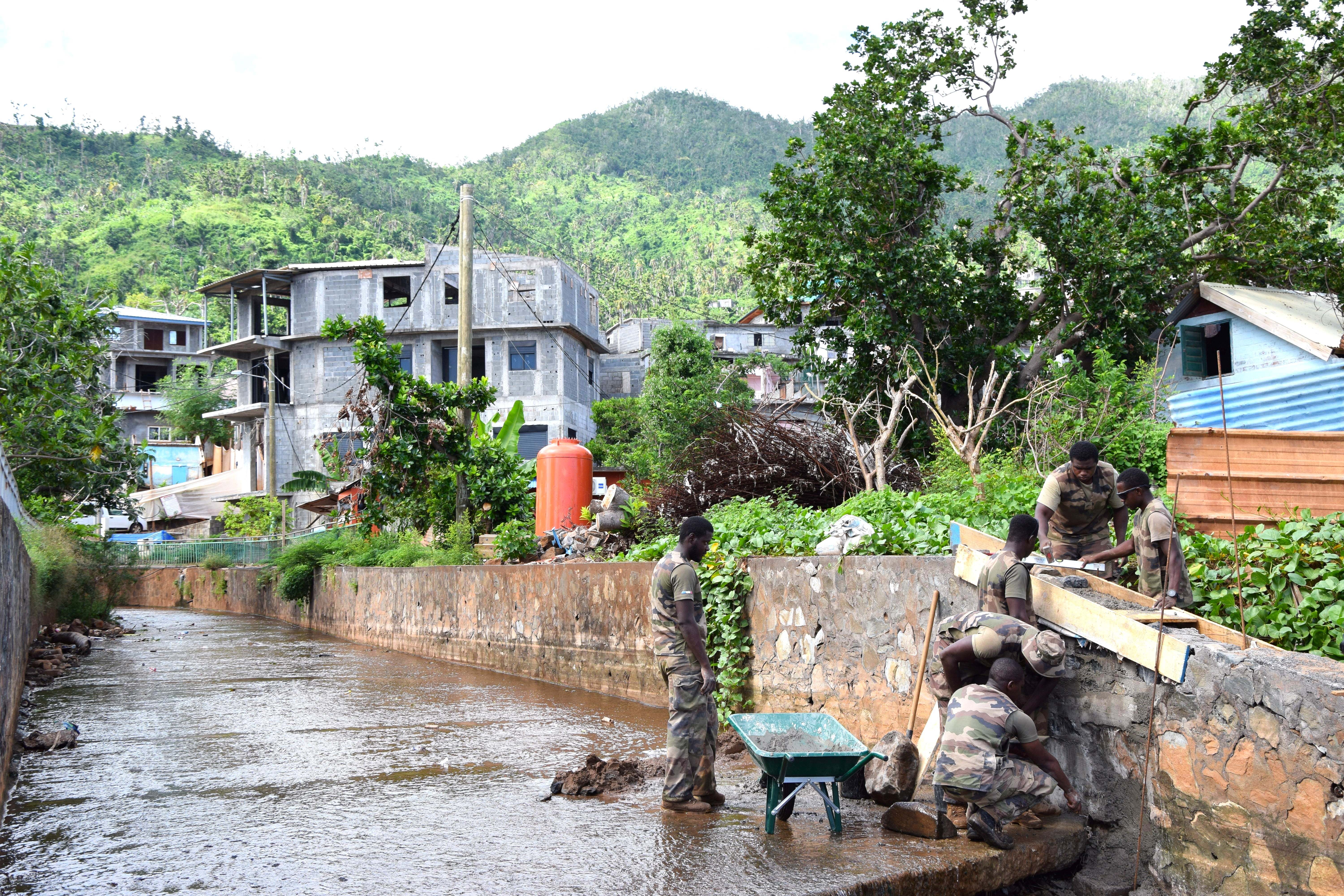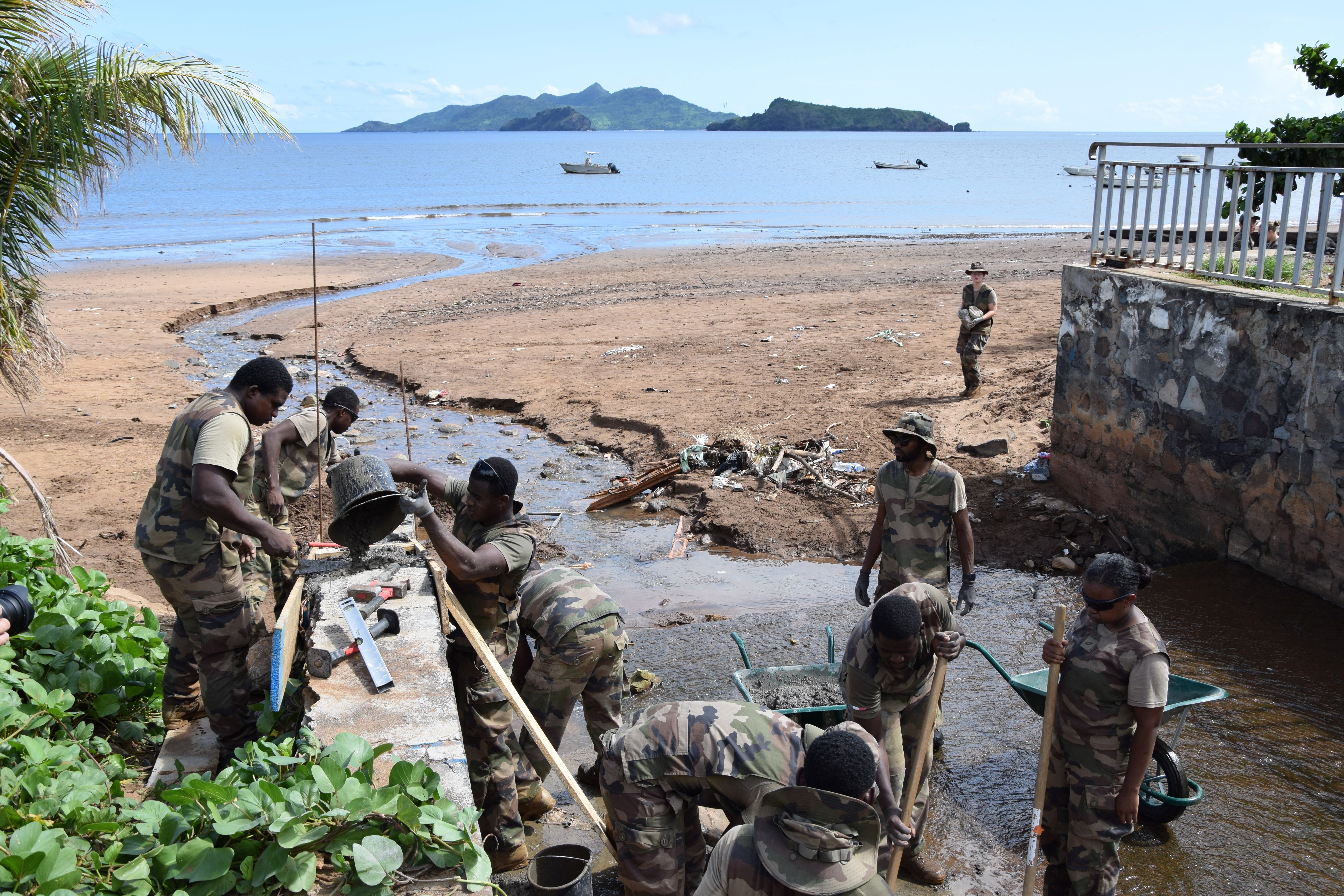 Sur la plage de Mtsamboro, ce mercredi 23 avril, une dizaine de militaires du bataillon reconstruction travaillent à la réparation d’un mur permettant l’écoulement de la rivière qui traverse le village jusqu’au lagon. « L’objectif est d’éviter que l’eau n’abîme le littoral. Il faut donc construire un ouvrage solide, capable de résister aux marées », explique, les pieds dans l’eau, le sergent Christian, du 19ᵉ régiment du Génie basé à Besançon, dont quatre militaires sont mobilisés sur ce chantier.