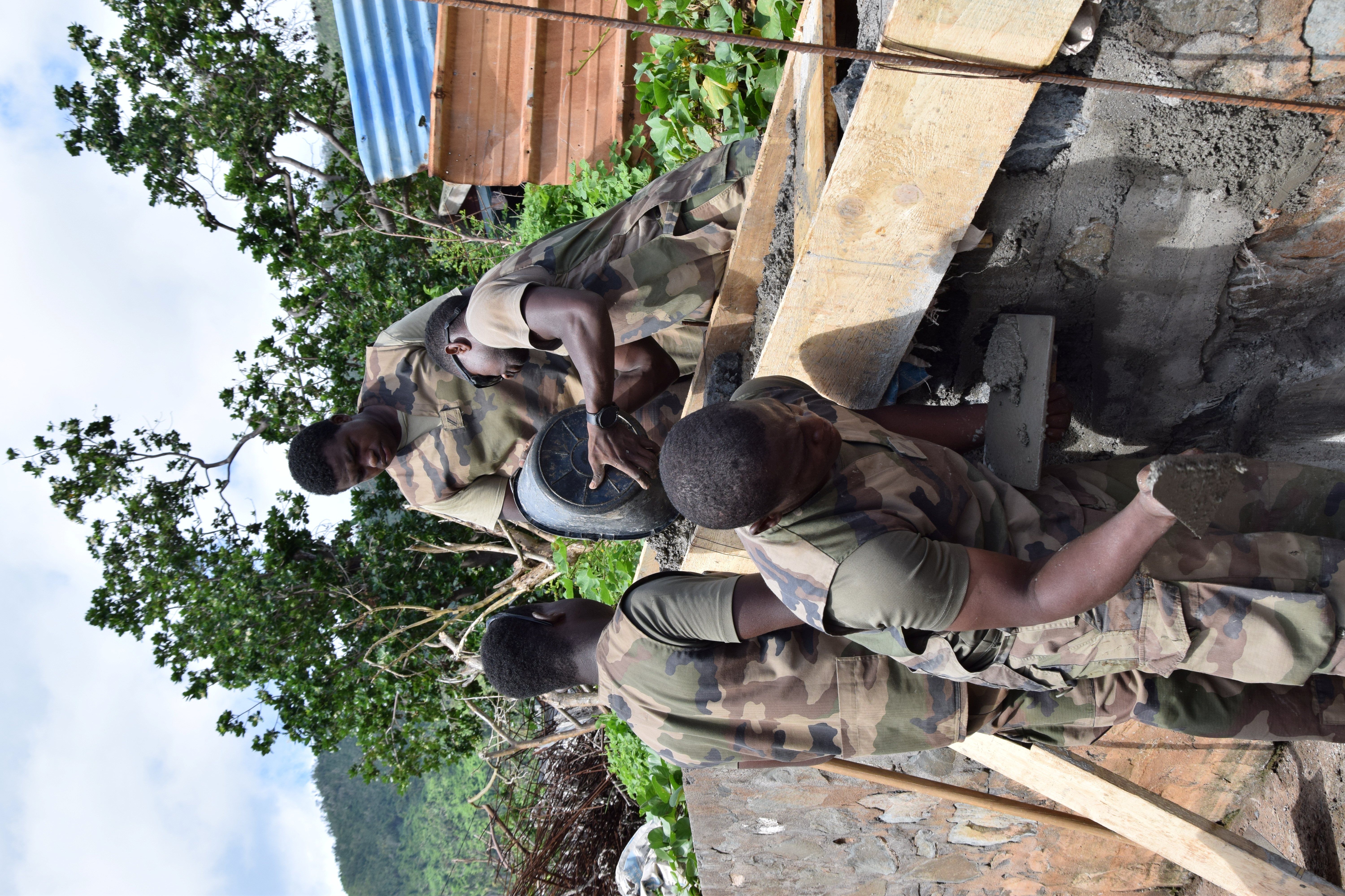 Nommés « sapeurs bâtisseurs », ils mettent leurs compétences en maçonnerie au service des autres militaires du bataillon. Un partage de savoir-faire essentiel pour mener à bien les différentes missions : retrait des embâcles dans les rivières, réparation des toitures de bâtiments publics ou d’écoles, ou encore réhabilitation de salles de sport.