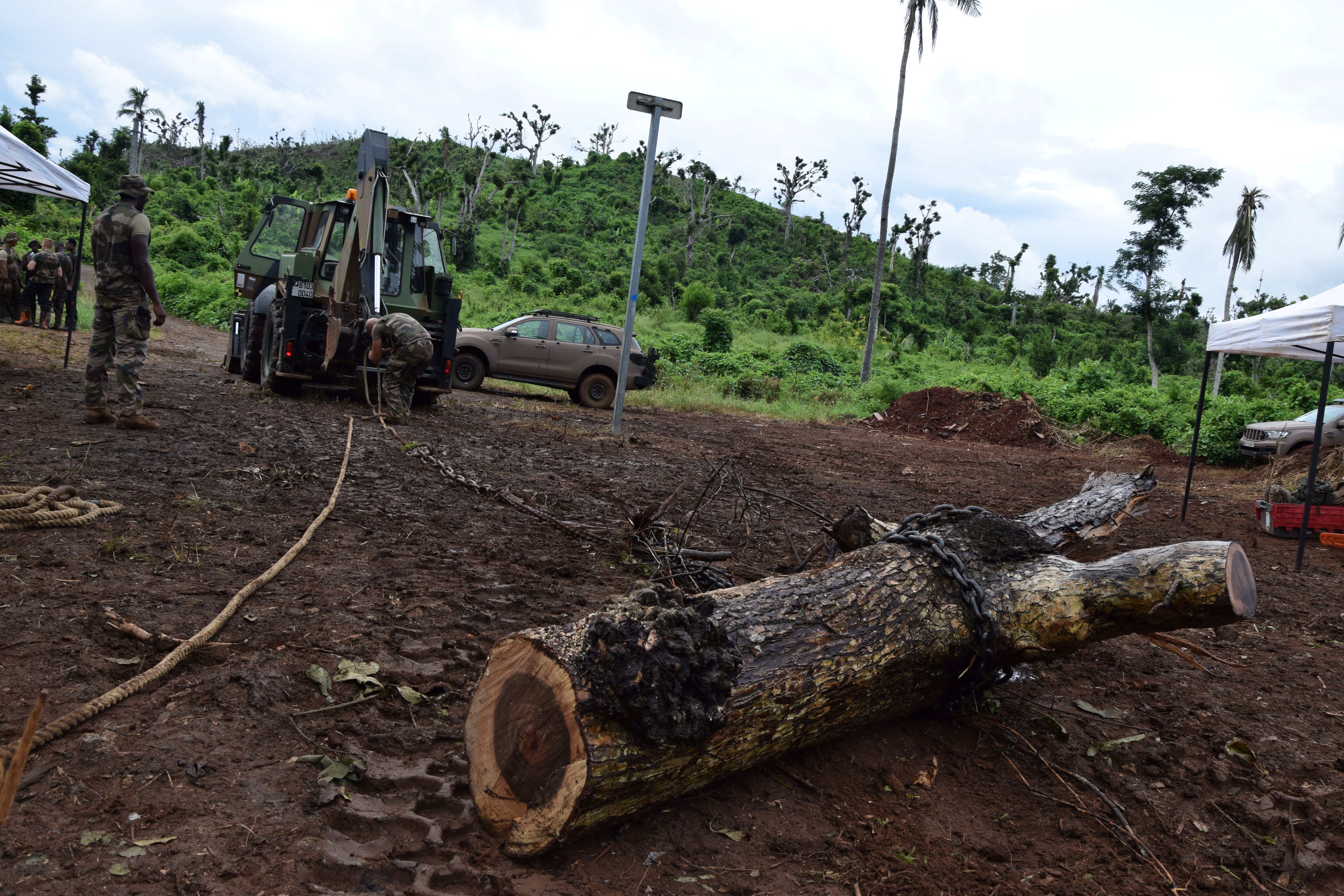 Le bataillon reconstruction opère en moyenne 7 chantiers simultanés par jour sur l’ensemble du territoire. « On a toute une liste de chantiers possibles que l’on peut faire et ensuite on les programme. On fait un point sur les compétences nécessaires avec nos équipes et on planifie le début des travaux directement en lien avec les mairies des communes », indique le colonel Segun. « A Mtsamboro, la commune nous a montré qu’il y avait des talus et des ravines abîmées suite au cyclone. On s’est rendu sur place pour voir si on avait la capacité de les réparer et on a ensuite organisé l’acheminement des matériaux et du matériel adéquat ».
